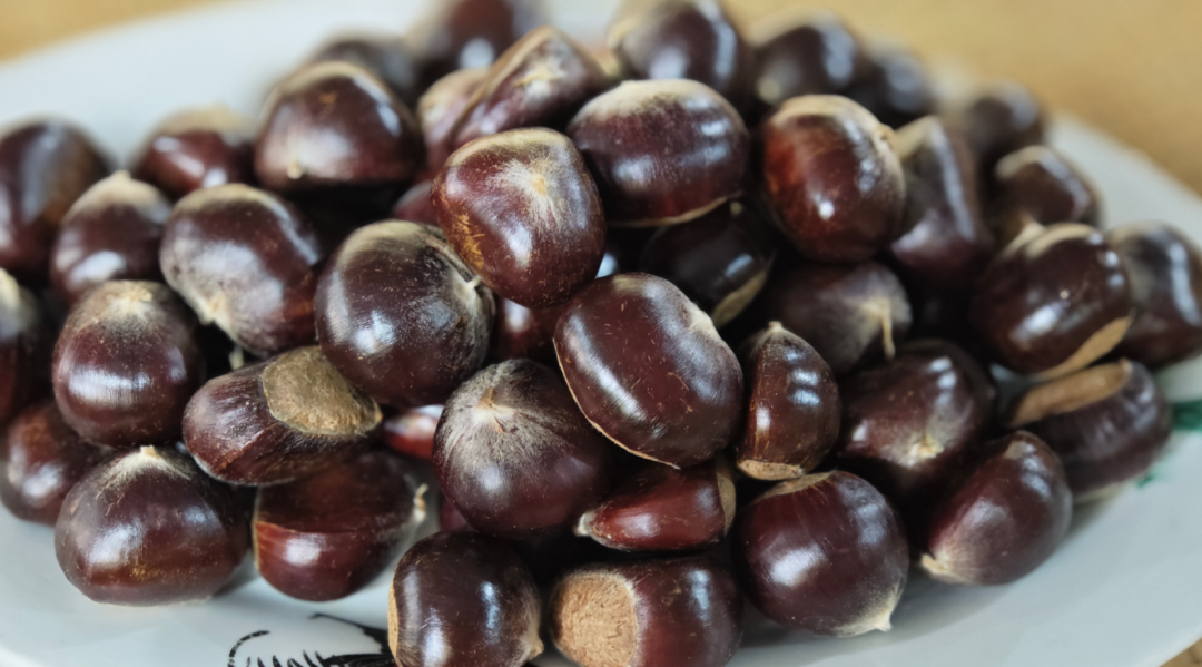 面前堆着刚从树上摘的新鲜油栗,