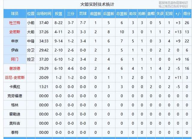 火箭队数据:杜兰特26分6板3助3断、申京22分7板5助、谢泼德16分6板4助、阿门16分6板1助、史密斯13分10板3助、伊森6分5板1助、芬尼-史密斯3分1板2助、卡佩拉3板2帽