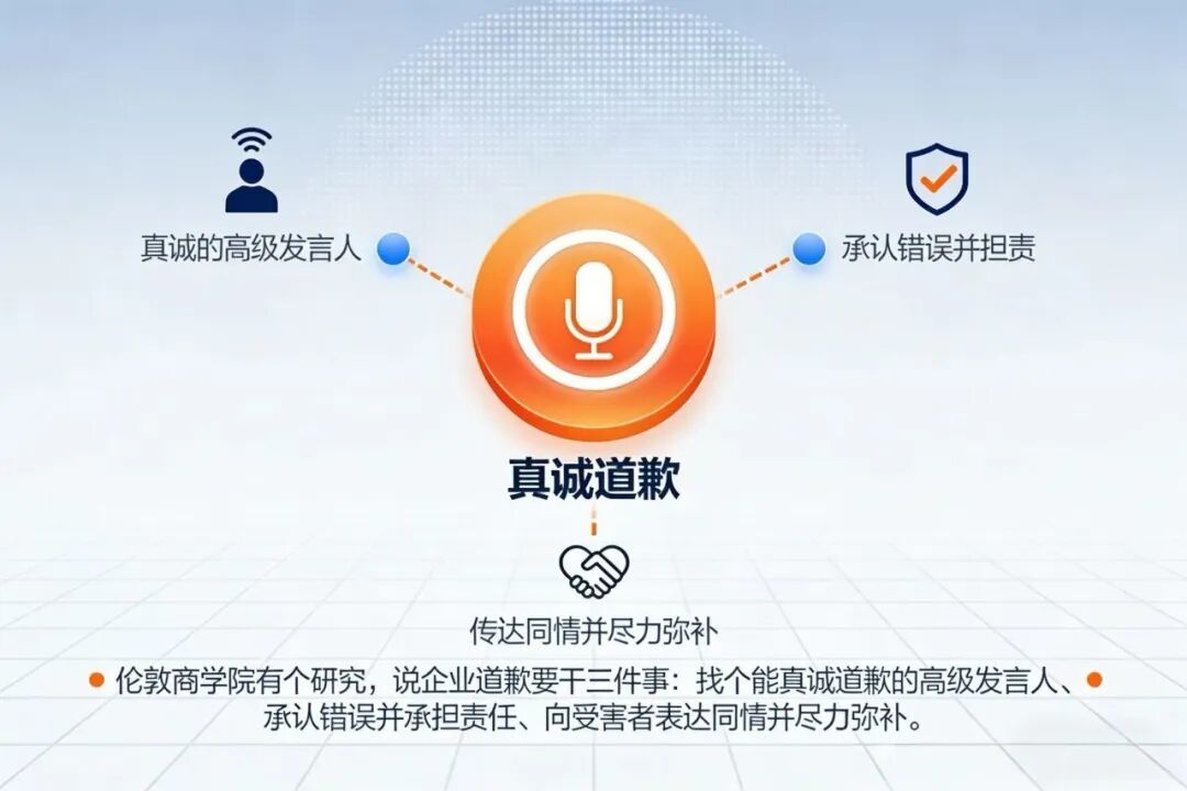 伦敦商学院有个研究,说企业道歉要干三件事:找个能真诚道歉的高级发言人、承认错误并承担责任、向受害者表达同情并尽力弥补,这套逻辑在中国的社交媒体上同样适用。